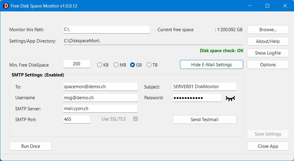 Der Diskspacemonitor dient zur Überwachung des freien Diskplatzes bei unbeaufsichtigten Servern bzw. als Server verwendeten Computern. Es lässt sich mit der App ein Verzeichnis oder UNC-Pfad auf ausreichend Diskplatz überwachen und optional eine E-Mail zu versenden. Die App kann sowohl im manuellen Modus (mit GUI) oder im automatischen Modus (ohne GUI, z.B. via Terminal/Konsole) verwendet werden.
